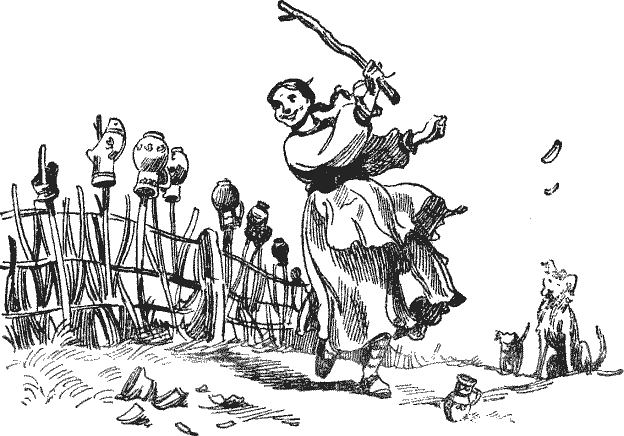 Но горшки не захотели подвинуться. Взяла она палку и ну их колотить! Только черепки во все стороны летят. Перебила