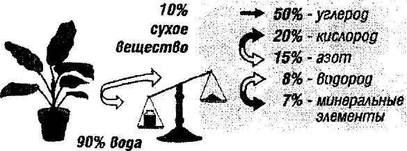 Дело в том, что зеленая масса растений на 90% состоит из воды и только на 10% из сухого вещества. А минеральных элементов в сухом веществе всего 7%. Из чего же состоят другие 93% растений? Это углерод 50%, кислород 20%, азот 15% и водород 8%. Таким образом, 93% сухого вещества растений берется из атмосферы!