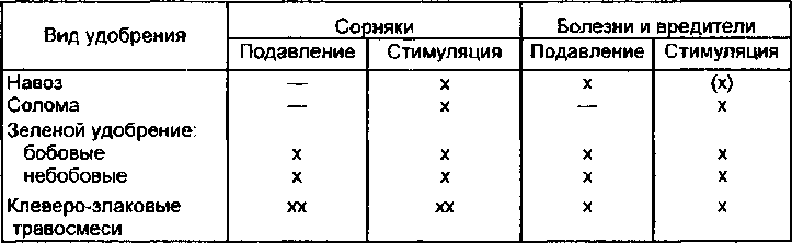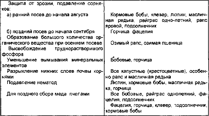 В таблице нашло отражение возможное отрицательное действие зелёного удобрения, которое может проявиться вследствие ошибок в его использовании или выборе культур. Увеличение засорённости может быть следствием позднего скашивания обсемененных растений, а увеличение болезней следствием несоблюдения правил чередования культур, о чем будет сказано ниже.