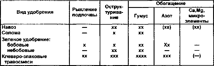 В табл.7 приводится сравнительная характеристика разных видов органических удобрений с точки зрения их воздействия на свойства почвы. Действие удобрений оценивается по балльной системе. Из этой таблицы видно, что зелёное удобрение, особенно злаковобобовые смеси, не уступает навозу по способности обогащать почву гумусом и азотом, но уступает по обогащению некоторыми питательными элементами. Это легко объяснить: сколько зелёное удобрение взяло минеральных элементов из почвы, столько же оно и возвращает после отмирания. Азот и гумус составляют исключение, так как их количество увеличивается за счет способности растений использовать азот и углерод из воздуха. Поэтому зелёное удобрение не исключает полностью внесение навоза или компоста, обогащённых калием, кальцием, фосфором и т. д., но позволяет сократить их дозу.