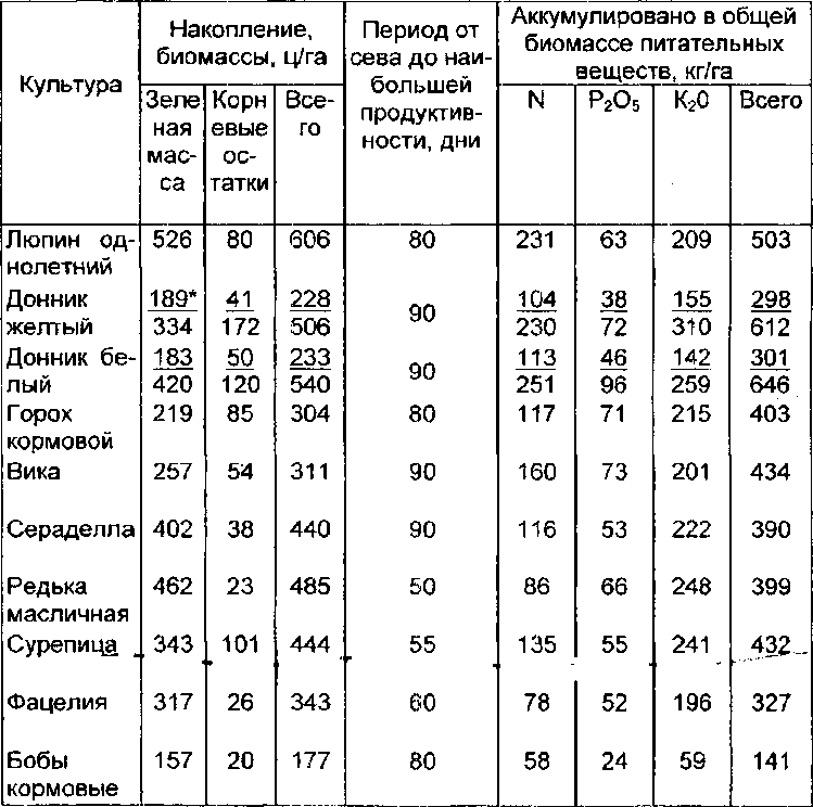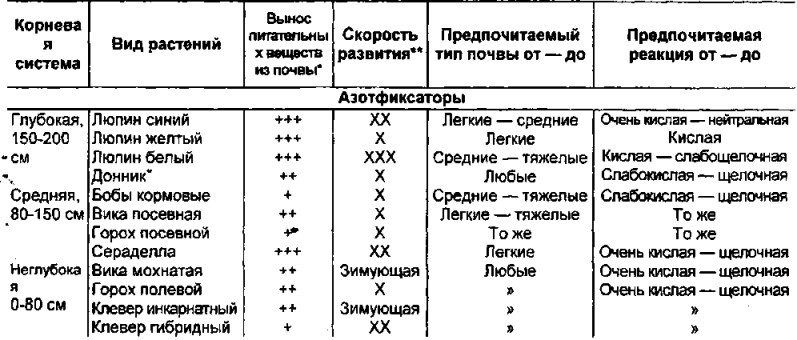 В табл.9 приведена характеристика требовании к почве основных культур, используемых на зелёное удобрение. Графа «Вынос питательных веществ из почвы» характеризует требование к плодородию: чем выше вынос, тем более требовательна в выборе культуры на зелёное удобрение, важно также знать, как быстро она растёт, какова её продуктивность с точки зрения способности накапливать органическое вещество за счет фотосинтеза, какими питательными "элементами она обогатит почву. Эти данные, полученные в условиях средней полосы России, приведены в табл.10.