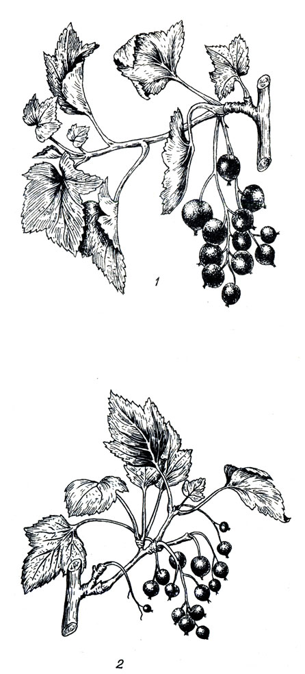 Плодоношение черной смородины на плодушках двухлетнего (1) и трехлетнего (2) возрастов