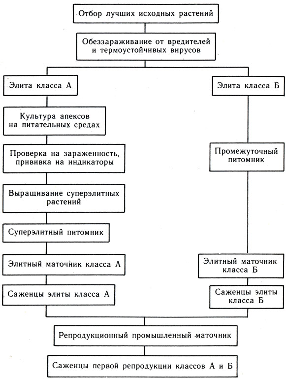 Система производства посадочного материала класса А сложнее. Она включает отбор лучших исходных растений размножаемых сортов по продуктивности и внешнему виду. Исходный материал класса А обязательно обеззараживают от вирусов и микоплазм термо- и тканевой терапией. Из верхушечной меристемы отделяют апексы (стеблевые верхушки) и культивируют их в пробирках на искусственных питательных средах, затем в горшках. На зараженность вирусами их проверяют, прививая растения-индикаторы. Размножают только те особи, которые окажутся здоровыми.