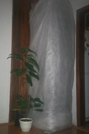 Весной заношу в дом стеллаж, вставляю лотки и закрываю всю конструкцию нетканым материалом (агротекс). Время от времени меняю местами верхние и нижние лотки. Дело в том, что нижние хуже освещаются. За 10-12 дней до посадки стеллаж закрываю непрозрачным материалом. Вот и все премудрости, связанные с конструкцией. Подобное приспособление имеет ряд достоинств: