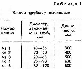 Выпускаются рычажные ключи пяти размеров. В табл.1 указаны размеры труб, которые может охватить ключ того или иного номера. Но это не значит, что с помощью соответствующего ключа можно сразу справиться с любым соединением.
