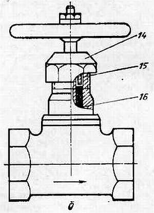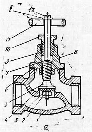 а со спецвтулкой; б с накидкой гайкой; 1 корпус; 2 гайка; 3 шайба; 4 прокладка резиновая; 5 клапан; 6 прокладка из льна или паранита; 7 шток; 8 головка корпуса; 9 сальниковая набивка; 10 спецвтулка; 11 маховик; 12 шайба; 13 винт; 14 накидная гайка; 15 втулка сальника; 16 сальник