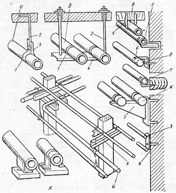 а на подвеске; б на подвеске с опорной балкой; в скобой; г на кронштейне; д на кронштейне и хомуте; е крючком; ж на кронштейне с подкосом; з сваркой к кронштейну; и к опорным столбам или колоннам; к к уголкам; 1 хомут; 2 тяга; 3 болт; 4 балка: 5 скоба; 6 хомут; 7 подкос; 8 дюбель; 9 швеллер