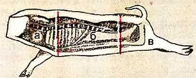 Существует еще один так называемый английский способ разделки свиной туши. Тушу подвешивают за задние ноги, потрошат, обмывают, разрезают спину вдоль позвонка, причем обе половины туши начисто отделяют от костистых осколков (рис. 2). После охлаждения туши обрезают голову, разрубают тушу на две половины. Каждую половину разделывают, как показано на рис. 3, на три части: а передок, б середина, в окорок.