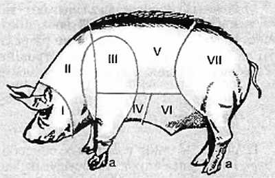 I голова: II шея; III передний окорок; IV грудинка; V свиные котлеты; VI брюшной край; VII задний окорок