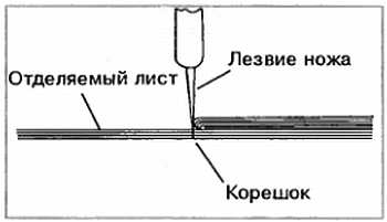 Получение очередного номера любимого журнала приносит в семью оживление, радость. Здесь всегда много интересного и полезного, а к некоторым материалам возвращаешься не раз годы спустя. К сожалению, со временем журналов накапливается столько, что их некуда девать. Волей-неволей приходишь к нелегкому решению оставить дома только небольшую часть публикаций, содержащих наиболее ценную, «руководящую» информацию. Поначалу отвечающие этому листы просто вырывались и складывались в папки с «ботиночными» тесемками. Получалось громоздко, неэстетично и неудобно в пользовании. Возникла мысль брошюровать коллекцию, но как? Теперь, после серии проб и ошибок, это кажется элементарно простым, но до такого нужно дойти. Подобная задача наверняка встает перед многими читателями, поэтому рискну поделиться нашим семейным опытом. В качестве обложки будущего «тома» вырезок берется обложка, например, от номера за данный год. Ее нужно аккуратно отделить от блока в виде единого целого. Нужные страницы ни в коем случае не следует отрывать только подрезка у корешка концом лезвия перочинного ножа обеспечит последующую аккуратную сборку. Прежде чем подрезать лист, обратите внимание, с какой стороны от него находится более толстый слой страниц. Именно он послужит удобной направляющей своего рода линейкой для лезвия ножа (рис. 1).