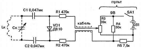 К 9-вольтовой батарейке типа «Кроны» (GB1) присоединены два делителя напряжения на постоянных резисторах R4, R5 и в виде переменного резистора R3. Такая комбинация позволяет подавать на электронный конденсатор VD1 напряжения разной полярности, что способствует расширению пределов изменения емкости. Эти напряжения поступают на стабилитрон через высокоомные резисторы R1, R2, исключая влияние на контур приемника Ск, Lк емкости самого оператора. Электронная емкость VD1 связана с колебательным контуром (входным, гетеродинным) через конденсаторы относительно большой емкости C1, С2, что предотвращает замыкание упомянутых цепей постоянного тока через малое сопротивление контурной катушки Lк. Предлагаемое устройство неплохо работает в диапазонах средних и длинных волн (на коротких не проверялось) с приемниками, у которых максимальная емкость секции блока порядка 470500 пикофарад. Стабилитрон, кроме указанного, может быть типа Д814В. Постоянные резисторы берут типа MЛT-0,125-0,5. Переменный резистор типа СП-0,4 либо другой малогабаритный. Схемы управления каждым из двух контуров в принципе одинаковы, но конструкция пульта несколько упростится, если элементы R3-R5 не дублировать, а сделать общими. Если заводской блок настройки имеет максимальную емкость около 380 пикофарад, вводимый в приемник конденсатор связи С1 берут емкостью 2200 пикофарад (рис. 2).
