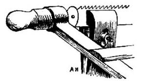 Что касается пилящих инструментов, то, как уже говорилось ранее, они точатся напилками, при чем желательно иметь еще и специальные маленькие тисочки для зажимания полотна пилы, с тем, чтобы полотно при точке не колебалось, и напилок шел точно в том положении относительно зубьев пилы, в котором его направляют (рис. 24).