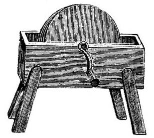 Для крупных тяжелых инструментов, например, топора нужно уже круглое точило, которое вращается при помощи ручки и все время касается нижней частью воды, находящейся в устроенном под ним корытце (рис. 25).