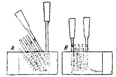 Выдалбливание гнезд производится так. Очертив карандашом, с помощью наугольника, края гнезда, берут шиповое долото, устанавливают его немного отступя от черты прямою стороной к ней, а фаской внутрь гнезда и начинают долбить, ударяя киянкой по рукоятке долота. Сделав прямой надрез волокон, долото вынимают и, поставив его наклонно, несколько отступя от прямого, начинают косой надрез, так чтобы он сошелся с первым. По мере углубления долота, скалывают щепу. Вынув первый слой дерева, долбят таким же образом дальше, пока глубина гнезда не достигнет требующейся величины. Когда работа долотом будет окончена, полученное гнездо сглаживается стамеской как по дну, так и по намеченным перед началом работы краям.(рис. 30).