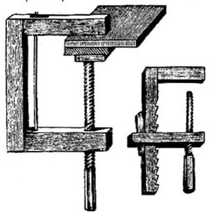 Если хотят склеить широкую доску с более узкой, одна на другую, то есть риск, что меньшая доска, вследствие влияния жары или сырости, сможет отскочить. Чтобы избегнуть этого, такую склейку производят так: только что обструганные и смазанные клеем доски завинчивают в струбцинки и при этом вдвигают подходящий кусок дерева между винтом и более узкой или тонкой доской. Клей при этом должен быть не очень густым, а струбцинок тем больше, чем длиннее протяжение склейки.