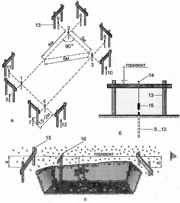 а схема разбивки здания; б устройство выноски и обноски; в контроль за глубиной разработки грунта; 1, 2, 3, 4 колышки, закрепляющие на местности углы здания; 5-12 колышки выноски, закрепляющие оси здания; 13 обноска; 14 гвоздь, установленный по отвесу над осью здания; 15 отвес; 16 визирка (высота визирки принимается в зависимости от уклона местности; при небольших уклонах она принимается равной h + а, или h + (а + в)/2; при расположении дома на косогоре фундамент выполняют уступами и изготавливают несколько визирок соответствующей высоты).