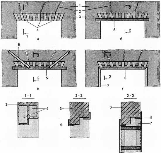 а расклинивание трещин стальными пластинами; б стальными уголками; в то же, при более длинном пролете, с дополнительной подвеской; г стальными уголками, соединенными со стальной обоймой простенков; 1 кирпичная стена; 2 трещина; 3 усиливаемая перемычка; 4 стальные пластины-клинья; 5 стальной уголок; 6 тяжи из полосовой стали; 7 стальная обойма простенка