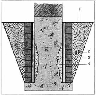 1 жирная глина; 2 кирпич, пропитанный битумом; 3 три слоя рубероида на мастике; 4 цементный раствор