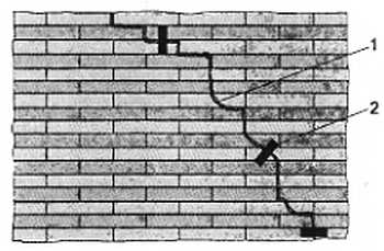 1 трещина: 2 маяк (цементный на наружных или алебастровый на внутренних стенах)