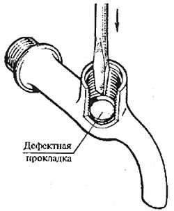 Иногда в одно из мест контакта седла и прокладки попадает частица песка или ржавчины. Эта соринка, приставшая к прокладке, мешает закрытию крана и из него будет подтекать вода; хотя меньше, чем при полном выносе прокладки. Чтобы устранить неисправность, 34 раза открывают и закрывают кран соринку должно вымыть водой. Если-же кран по-прежнему подтекает, а значит частицы песка или ржавчины остались, выкручивают головку и очищают прокладку ножом или отверткой.