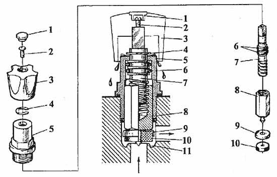 1 указатель; 2 винт; 3 маховик; 4 стопорная шайба; 5 корпус; 6 резиновое кольцо; 7 шток; 8 шпиндель; 9 клапан; 10 прокладка; 11 седло корпуса крана или смесителя