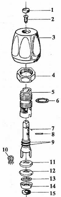 1 указатель; 2 винт; 3 маховик; 4 контргайка; 5 корпус; 6 прокладка; 7 шток; 8 штифт; 9 сальники; 10 сетка; 11 керамическая пластина штока; 12 керамическая пластина корпуса; 13 резиновая прокладка; 14 упорное латунное кольцо; 15 резиновое кольцо