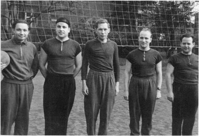 На обязательных утренних занятиях физкультурой: И. Я. Немцов, А Н. Корнилков, М. М. Зимбулатов, Л. Подойницын, И. К. Игнатов. Июль 1959 г., г. Берлин.
