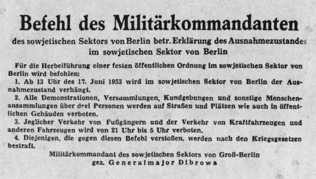Приказ советского военного коменданта Берлина о введении в городе чрезвычайного положения с 13 часов 17 июня 1953 г.
