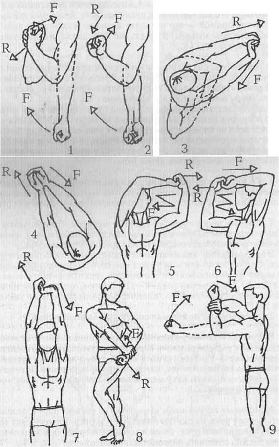 4. То же, что и в упражнении 3, но кисть левой руки подведи снизу под локоть правой руки (рис. 74). Направление движения правой руки вниз показано стрелкой F. В этом упражнении активно участвуют большие грудные мышцы, широчайшие мышцы спины и мышцы антагонисты левой руки.
