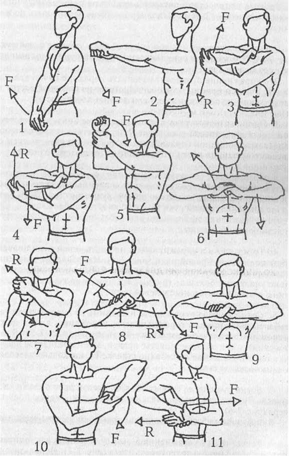 При выполнении упражнений 8 и 9 руки, согнутые в локтях, находятся перед грудью. Чтобы удержать руки в этом положении во время вращения кистью одной из рук, сильно напряги мышцы плечевого пояса это создаст дополнительный тренировочный эффект. Вращательные движения кисти и предплечья весьма благоприятно сказываются и на состоянии лучезапястного и локтевого суставов.