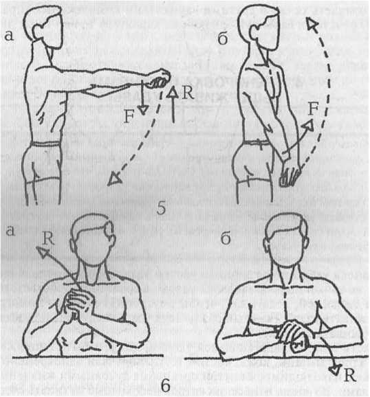 5. Поочередно поднимай и опускай правую руку, преодолевая сопротивление, создаваемое левой рукой (рис. 11 -5а). В конечных фазах движения (рис. 1156) опорную руку быстро перенеси в нужное положение. Упражнение развивает дельтовидные и другие мышцы плечевого пояса.