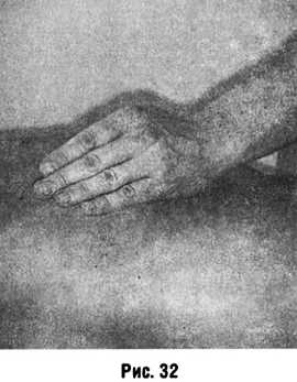 1-я форма (стабильное) все пальцы кисти сомкнуты, ладонной поверхностью кисть при слегка согнутых пальцах лежит на массируемом участке, продвижения кисти нет, наносят ритмичные удары (прием «похлопывание») (рис. 32).