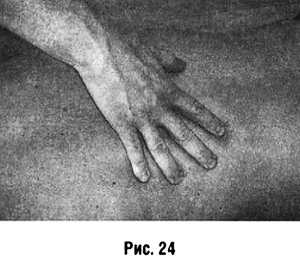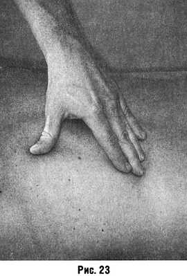 Растяжение выполняют ладонными поверхностями пальцев кисти, растягивая кожу между I и IIV пальцами, расположенными друг против друга, не отрывая пальцев от массируемой поверхности (рис. 23).