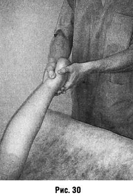 Встряхивание обеими руками берут кисть или стопу массируемого, фиксируют ее, и быстрыми, следующими друг за другом движениями встряхивают конечность в горизонтальном (вправо-влево) или вертикальном (вверх-вниз) направлении (рис. 30).