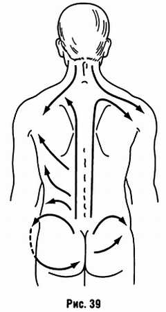 Поскольку отток лимфы происходит в лимфатические узлы, расположенные в противоположных областях в надключичной, подмышечной с одной стороны и паховой с другой, а сеть лимфатических сосудов, особенно в поверхностных тканях, переплетается, допустимо массировать спину по двум направлениям от грудного отдела к подмышечным лимфатическим узлам, а от поясничного к паховым (рис. 39).