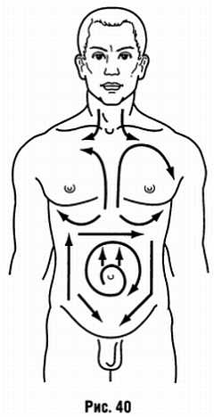Массажные движения должны быть направлены на передней поверхности грудной клетки от нижних ребер (реберной дуги) к большой грудной мышце, ключице дугообразно вверх, а на боковой к подмышечной ямке (рис. 40).