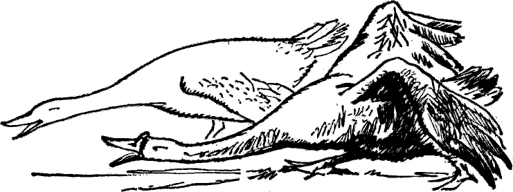И тут он увидел удивительную вещь. Серый гусак лежал на боку. Его шея вытянулась по земле, как обрывок пылесосного шланга. Белый гусь, подняв голову, смотрел на упавшего приятеля.