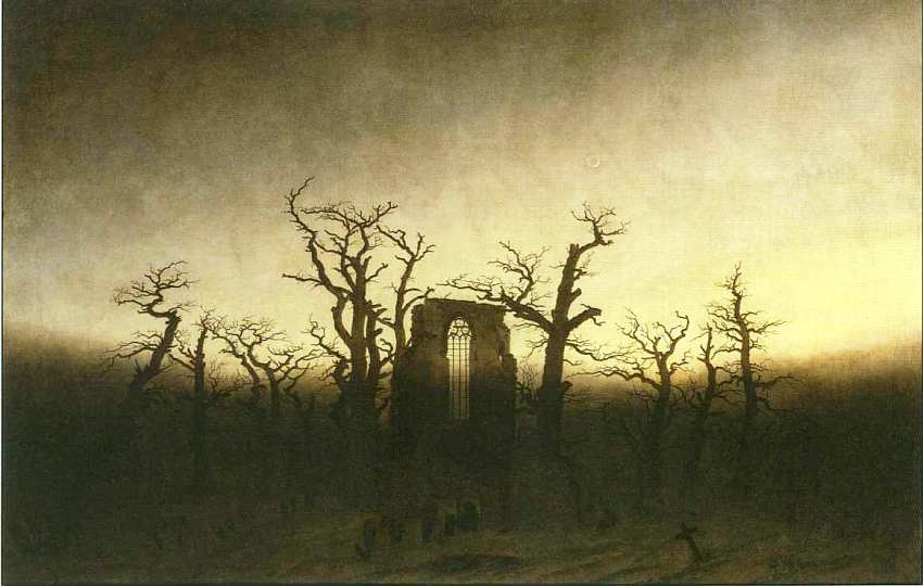 «Монах у моря» на академической выставке в Берлине в 1810. Эти два полотна произвели огромное впечатление на ценителей искусства того времени, они считаются классикой немецкого романтизма. Если в первом произведении монах изображен взирающим на бесконечный простор моря, стоящим на грани между светом, жизнью и черной бесконечностью небытия, то в парной работе небытие, смерть одержало верх. Монахи несут гроб к руинам готической церкви на похоронную службу. Мрачное впечатление производит кладбище, силуэты старых дубов создают ощущение, что это живые существа, которые простирают руки к небу. Художник мастерски выстраивает перспективу. Особое мистическое звучание полотну придает лунный свет. Фридрих виртуозно владеет искусством композиции, он намеренно и революционно для своего времени прост, аскетичен. Произведение фактически делится на две части: черный низ и более светлый верх. Это авторский стиль художника впечатляющая, убедительная простота и глубина чувств, которая достигается с помощью композиционного лаконизма. Отличительной чертой всех работ мастера стал этот психологический символизм пейзажа и колорита.