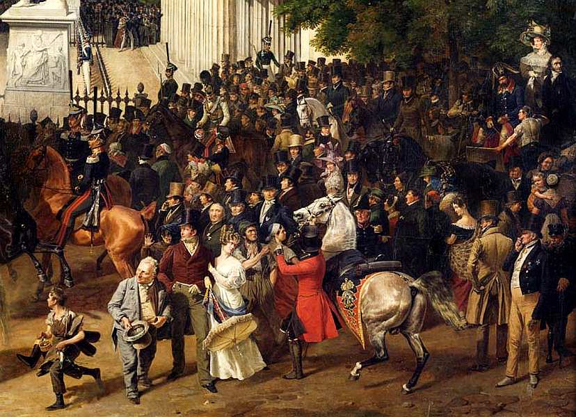 Данная работа была заказана Крюгеру великим князем Николаем Павловичем, зятем короля Пруссии, в 1824. Долгое время она находилась в Зимнем дворце в Санкт-Петербурге. Незадолго до Первой мировой войны картина была передана в Берлин в качестве подарка царя императору Пруссии. Художник со всей тщательностью изобразил сцену триумфального въезда прусского шестого бранденбургского драгунского полка, детали отличаются документальной достоверностью. Полком командует великий князь, который уже через год, в 1825, станет русским императором Николаем I. Вопреки устоявшейся традиции создания парадных и военных портретов Николай помещен живописцем не в центр картины, а в левый край. Он направляется для приветствия к королю Фридриху III. Интересно, что в этом полотне мастера не интересует формальный сюжет изображение военного парада под предводительством правящих лиц, в центре его внимания жанровая сцена, собрание людей: обывателей, лавочников, знати и богемы тогдашнего Берлина. Именитые лица города изображены в толпе как на традиционных портретах. Зрители того времени с легкостью узнали бы их, здесь и военные, и знаменитые профессора, и художники, в частности скульптор Иоганн Готфрид Шадов, архитектор Карл Фридрих Шинкель, певица Генриетта Зонтаг и виолончелист Никколо Паганини. Желанием создать коллективный портрет берлинцев объясняется старомодная композиция картины. Пространство тесно заполнено, сцена написана достаточно условно, она выглядит неестественной из-за скученности. Кроме того, местные жители того времени узнали бы точно написанное здание Арсенала и великое творение архитектора Шинкеля здание Новой Гауптвахты.