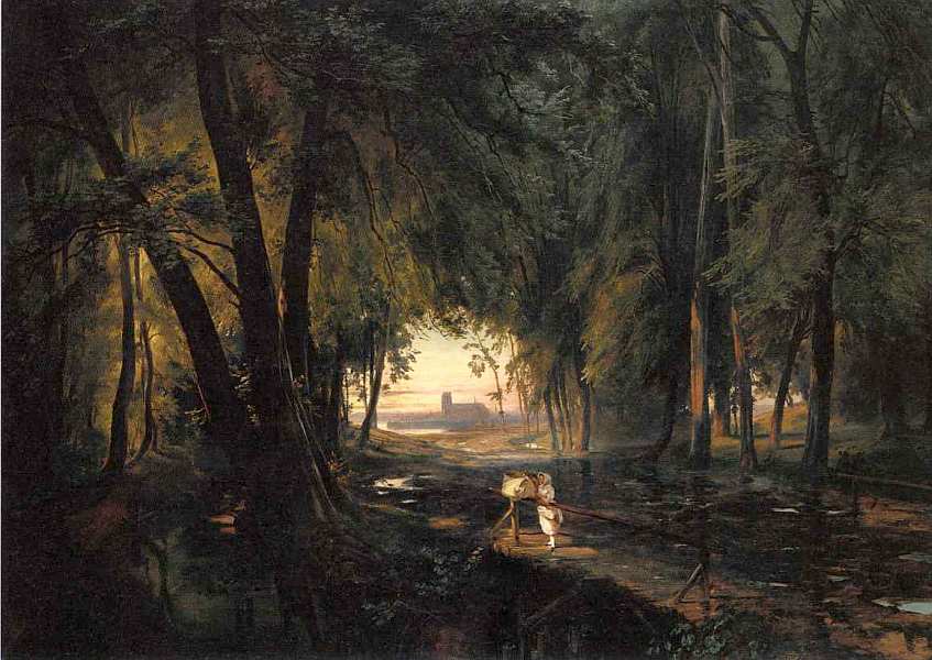 Эта картина создана в последний период творчества живописца. Он исполнил целый ряд пейзажей с изображением лесов и болот. В подобных сюжетах его привлекала возможность отобразить мистическую темноту, глушь этих мест, в чем, безусловно, чувствуется отзвук романтической поэзии, которая была близка Блехену в ранние годы его жизни. Кажется, что это традиционный идиллический пейзаж, однако при внимательном рассмотрении становится заметна общая мрачность сцены, созданные чисто живописными средствами. Молодую крестьянку с тюком хвороста окружает темнота величественного леса. Светлое пятно слева лишь усиливает тревожность взгляда женщины. Блехена притягивали резкие, контрастные тени от солнца. Художника преследовала депрессия, переросшая в тяжелую болезнь, о чем свидетельствуют его картины: через слой типичной для того времени романтико-идиллической живописи словно просвечивают неустроенность, громадный отчуждающий мир. По земле разбросаны обломки веток, дорога разбита, недавно был сильный шторм. Автор активно использует контрастные эффекты. Фигура испуганной женщины рифмуется с монументальным старинным готическим замком вдали, окутанным неземным золотым светом небес. Карл Блехен мастер подобных деталей, именно благодаря тонкому артистическому чутью его, казалось бы, обычные работы несут в себе многообразные смысловые оттенки, которые не сразу открываются зрителю.