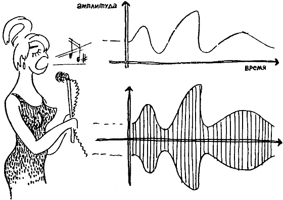 Перейдем к более сложному сигналу. Вы говорите в микрофон и изменяете тем самым сопротивление угольного порошка, а значит, и величину тока в его цепи. Так речь преобразуется в электрический сигнал причудливой формы. Перенесем этот сигнал на волну. Для этого на ней надо «вырубить» в точности весь его узор.