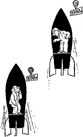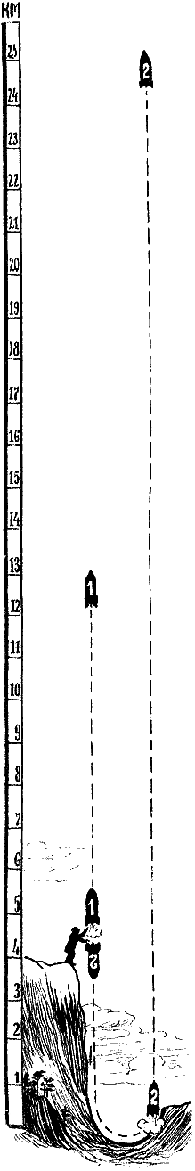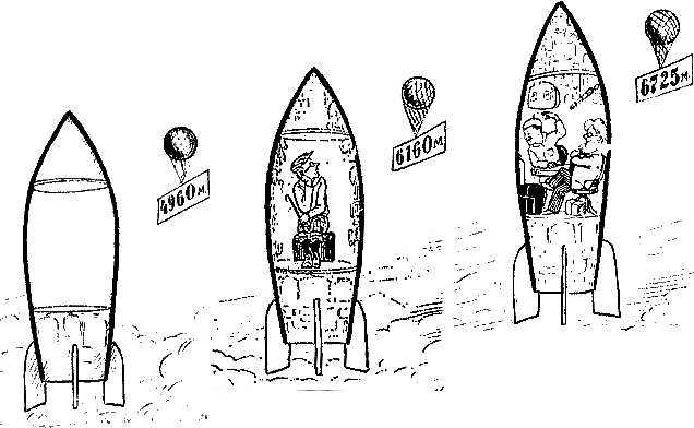 Если израсходовать все горючее целиком, то полет ракеты прекратится на высоте 9190 метров. Но можно выключить ракетные двигатели в тот момент, когда еще останется, например, 68 килограммов топлива. В этом случае ракета поднимется на высоту 9360 метров. Следует оговориться, что взятые нами ракеты очень легки по сравнению с их объемом.