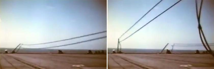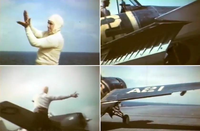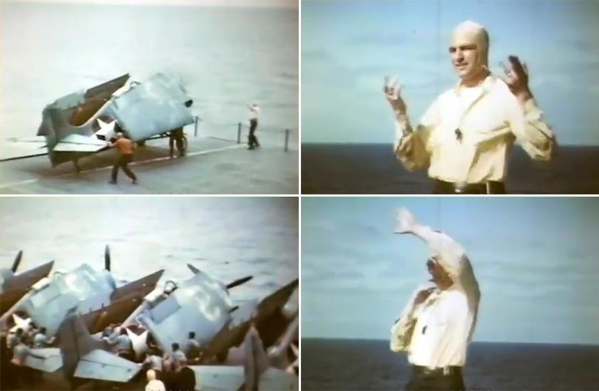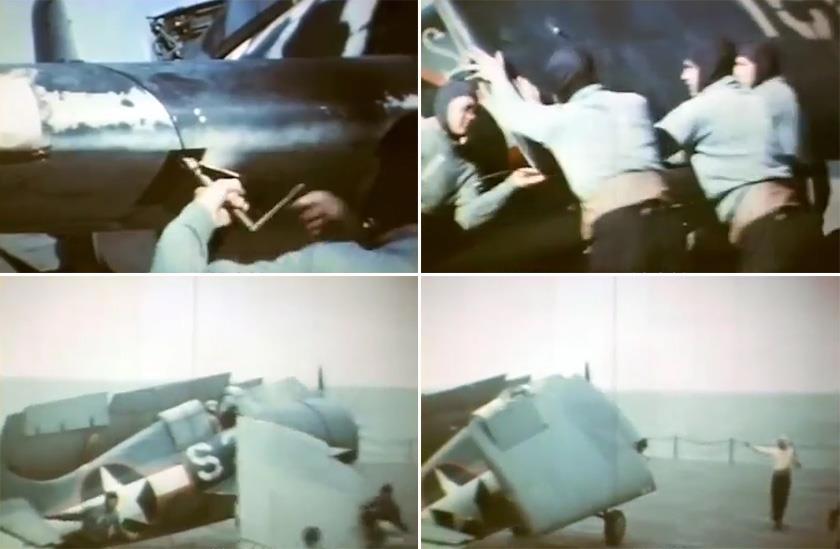 Если севший самолёт имел складывающиеся плоскости а большинство американских палубников их имели далее шёл этап «минимизации парковочных габаритов». В случае машин, снабжённых системой механизированного складывания, было достаточно подать команду пилоту, но в случае самолётов старых типов (F4F, FM, TBD) этим должна была заниматься палубная команда. На кадрах выше виден процесс ручной разблокировки узла складывания, а затем само складывание плоскостей и последующая их фиксация с помощью страховочных тросиков силами команды «синих», работающих с данным самолётом.
