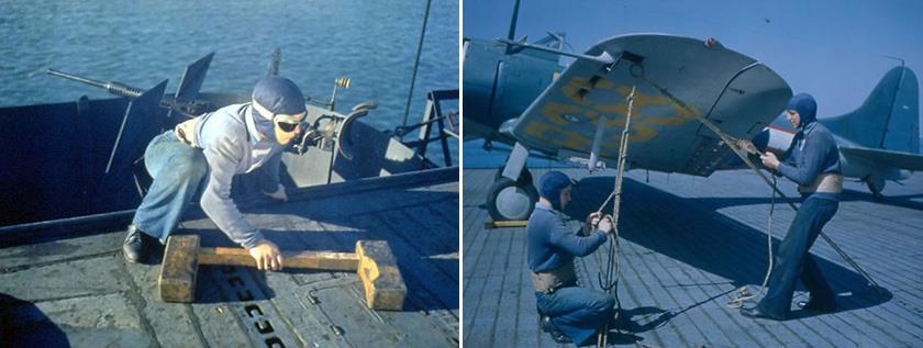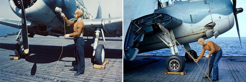 И последнее, что на этом этапе должны были сделать члены «синей команды», это осуществить «промежуточное» крепление самолёта. Первым делом под колёса шасси устанавливались деревянные стояночные колодки, а затем машину принайтовывали к палубе. На самом самолёте найтовы пропускали в специальные проушины или рымы, крепившиеся к лонжерону центроплана или плоскости, а система креплений на собственно палубах американских авианосцев в связи с переходом на палубную парковку претерпела серьёзные изменения. Если на ранних авианосцах (до «Лексингтонов» включительно) узлы крепления были врезаны в палубный настил «по сетке» с шагом около 1,5 м (примерно так же, как и на британских и японских авианосцах), то, начиная с CV-4 «Рейнджер», их заменили стальные полосы, идущие поперёк полётной палубы от борта до борта с шагом в 4-8 футов (1,2-2,4 м), в зависимости от корабля. В этих полосах по всей их длине были прорублены фигурные отверстия, образовывавшие своего рода заглублённые такелажные «утки», к которым и крепились найтовы.