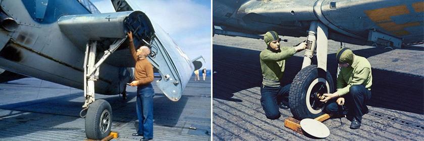 Однако основной его задачей была проверка технического состояние самолёта, о котором он сначала опрашивал экипаж машины, а затем сам проводил проверку основных узлов. При необходимости он мог вызвать на палубу дежурных механиков (Plane Inspectors) соответствующей специализации (мотористов, электриков, оружейников и т. д.), как для оперативного ремонта, так и для планового обслуживания отдельных узлов. На правом снимке такие механики в зелёных свитерах и зелёных шлемах с чёрной полосой занимаются, судя по всему, обслуживанием гидравлических тормозов шасси. В случае обнаружения серьёзных неполадок, которые невозможно было оперативно устранить на месте, капитан самолёта докладывал начальнику палубных операций о необходимости убрать машину на ангарную палубу для ремонта.