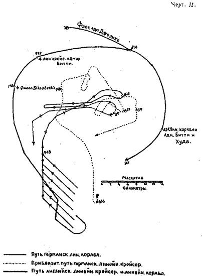 Схема маневрирования эскадр с 7 ч. 48 м. до 9 ч. 17 м. вечера 31 мая 1916 г.
