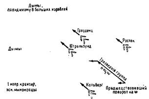 После того, как Хиппер принял "Кольберг" под свою защиту, он собрал всю группу на курсе SO, так как было еще недостаточно светло для того, чтобы установить тип и число неприятельских кораблей. При выполнении этого маневра в районе к N от наших броненосных крейсеров, примерно на параллельном курсе, но вне дальности выстрела мы заметили четыре крейсера типа "городов", три крейсера типа "Аретьюса" и большое число истребителей; с "Блюхера" их насчитали свыше двадцати. За этими боевыми силами виднелись еще другие дымы, и "Штральзунд" донес, что в NNW-м направлении видны по меньшей мере восемь больших кораблей (схема 4).