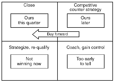 There are two obvious benefits to this. We see people all the time who understand the six Ps as their sales process, still using A-B-C and 507090 percent as their forecasting technique. But using phases alone fails to recognize the competitive risk in each deal. In a forecast, we need to know not only when the deal will happen but also if we are going to win it. Lumping the two together results in unpleasant surprises (see Figure 53).