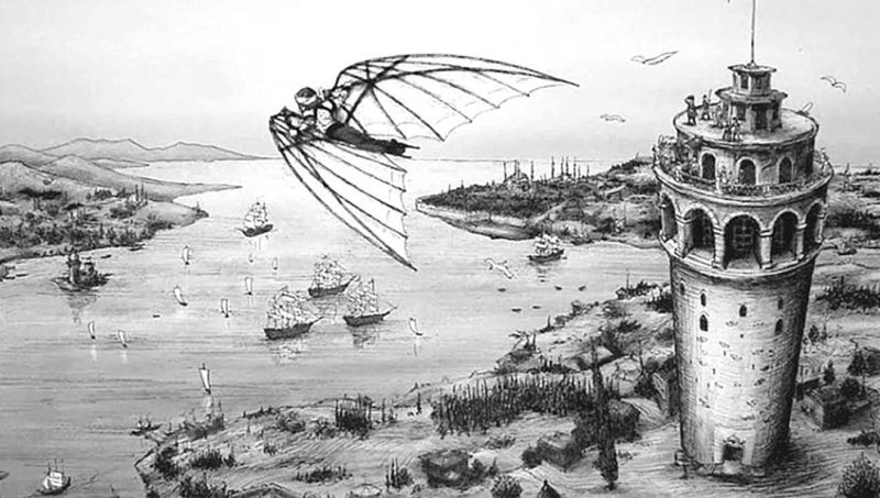 Обобщив свои наблюдения за полетом птиц и взяв за основу форму крыльев орла, Хезарфен Ахмет сконструировал жесткие крылья, напоминавшие то ли современный парашют, то ли дельтаплан. На холмистом стрельбище Окмейданы, пригороде Стамбула, Хезарфен совершил 9 пробных полетов, после чего решился на первый в мире межконтинентальный перелет. Sic! Именно так. Он решил пересечь на крыльях Босфор, который, как известно, разделяет Европу и Азию и соединяет Черное море с Мраморным. Это произошло в 1632 г. Турецкий Икар был не только отчаянным смельчаком, но и хорошим пиарщиком. Он проделал всё это на глазах султана Мурада IV, когда тот возвращался из медресе Синан-паши во дворец. Хезарфен спрыгнул с Галатской башни, расположенной в европейской части Стамбула. Подхваченный сильным юго-западным ветром, Хезарфен, преодолев 3358 м, приземлился на азиатской стороне города, на площади Доганджылар в Ускюдаре. Султан с восхищением наблюдал полет смельчака. «Затем Мурад-хан подарил ему кошель золотых монет и сказал: «Это страшный человек. Он способен делать всё, что пожелает. Нехорошо держать таких людей» и поэтому отправил его в изгнание в Алжир. Он умер там» (Эвлия Челеби).