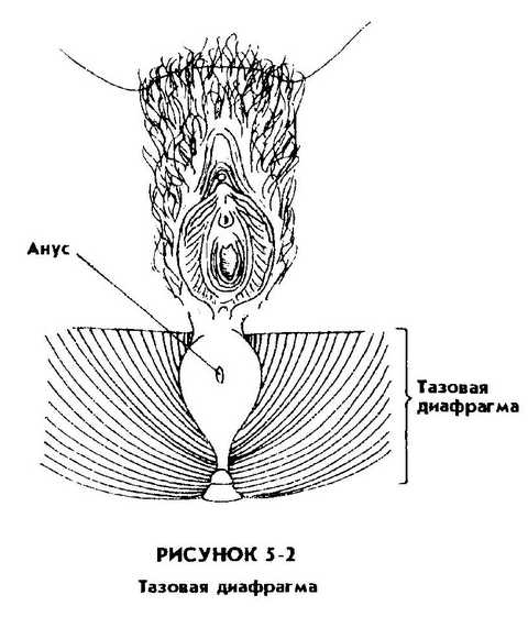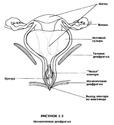 и влагалищем, ниже тазовой диафрагмы расположен еще один мышечный орган мочеполовая диафрагма. Она пронизывается уретрой, а сбоку к ней прикреплено тело клитора (рис. 53).